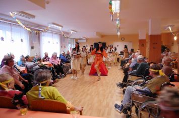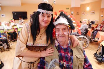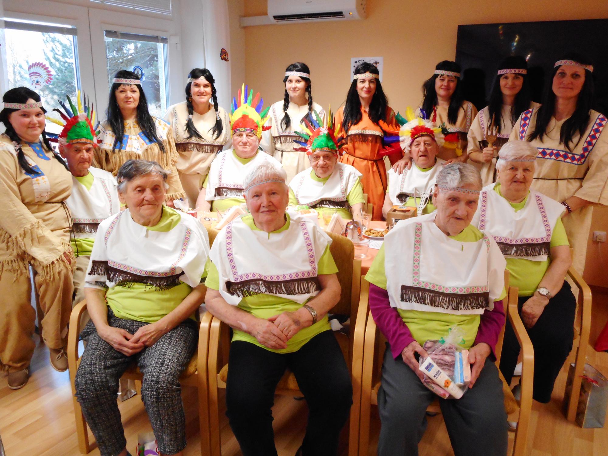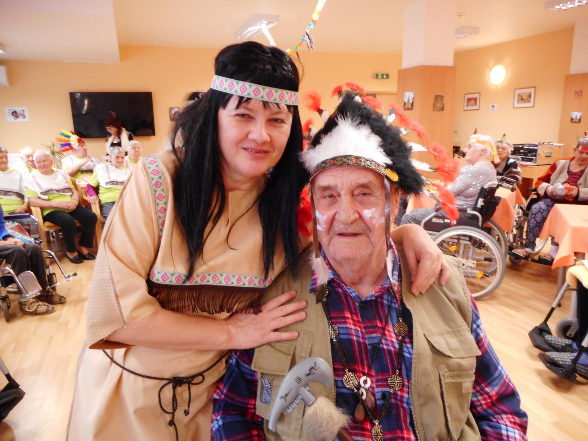 Dne 20. 2. 2019 se v našem zařízení konal Indiánský bál, kterého se zúčastnilo hned 59 indiánů z řad našich uživatelů. Všichni zúčastnění, včetně personálu obdrželi hned před vstupem do sálu indiánskou čelenku s perem, která byla vstupenkou na tento bál a také lístky na tombolu, na kterou se všichni moc těšil. Hned na úvod se nám představil pan Slováček pár písněmi, který nás svým hudebním a pěveckým doprovodem doprovázel po celou dobu našeho bálu. A jelikož k indiánům patří i indiánské tanečky tak i my, jako personál, jsme si na úvod nachystali překvapení a vystoupili jsme s úvodním tancem kolem indiánského týpí a poté i společným tancem s uživateli. Na toto vystoupení byly našity indiánské kostýmy, aby tak byla naladěna opravdová atmosféra. Vystoupení se všem velmi líbilo a také naši tanečníci si jej v kostýmech náležitě užili. Poté následovalo občerstvení v podobě zákusku a kávy a dále pokračovala volná taneční zábava, kdy se parket zaplnil a všechno osazenstvo rozvlnil. Pak následoval všem očekávaný okamžik v podobě tomboly, kdy každý zúčastněný, dle čísla svého lístku obdržel balíček, za který byl moc rád. A jelikož byla zábava stále v plném proudu a nikomu se nechtělo ani odcházet tak se v tanečních kreacích ještě nějakou dobu pokračovalo. Poté se všichni odebrali spokojení do svých pokojů. Tímto bychom za náš aktivizační tým chtěly moc poděkovat všem zaměstnancům – všem týmům za jejich krásnou spolupráci na této akci, vstřícnost a krásnou atmosféru, na které jste se všichni podíleli a bylo to na spokojenosti našich uživatelů vidět a také všem za příspěvky do tomboly.