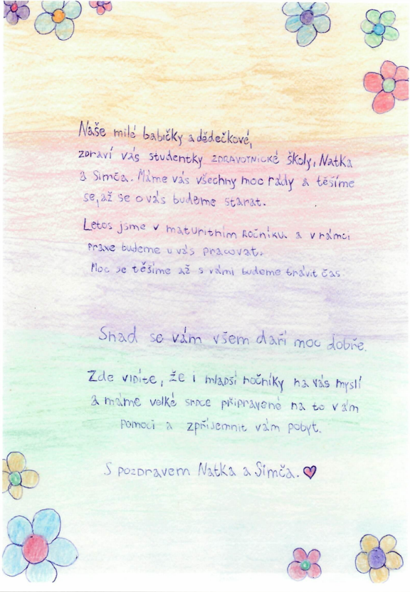 Dovolte mi srdečně poděkovat za péči a jednání Vašich zaměstnankyň, a to soc. pracovnic p. Hasalové a p. Lungové, a také celému úseku péče, jmenovitě především p. Drobilíkové.