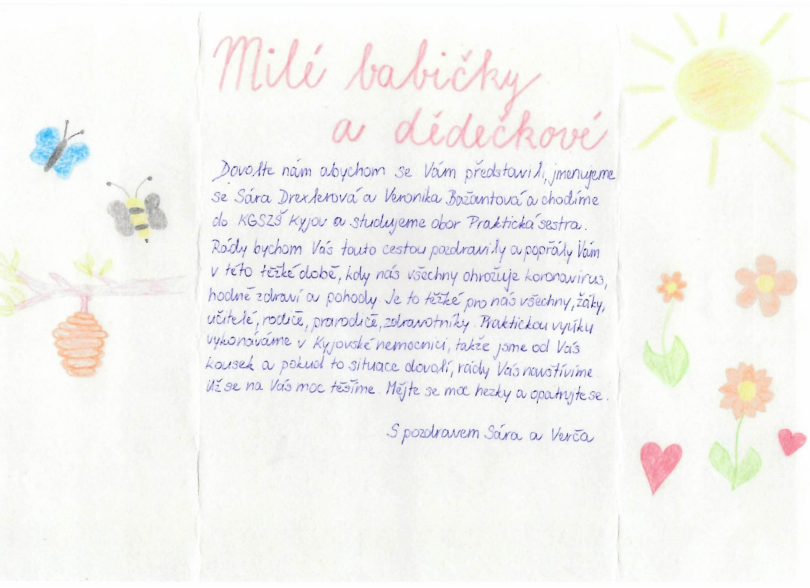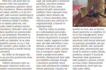 Kdykoli jsem šla nebo jela kolem vaší budovy, tak si na vás vzpomenu, držím palce, abyste tu covidovou zátěž zvládly. Jsem s vámi, držím palce a přeji vám všem kolem sebe lidí s pozitivním myšlením a hezkými láskyplnými vztahy.